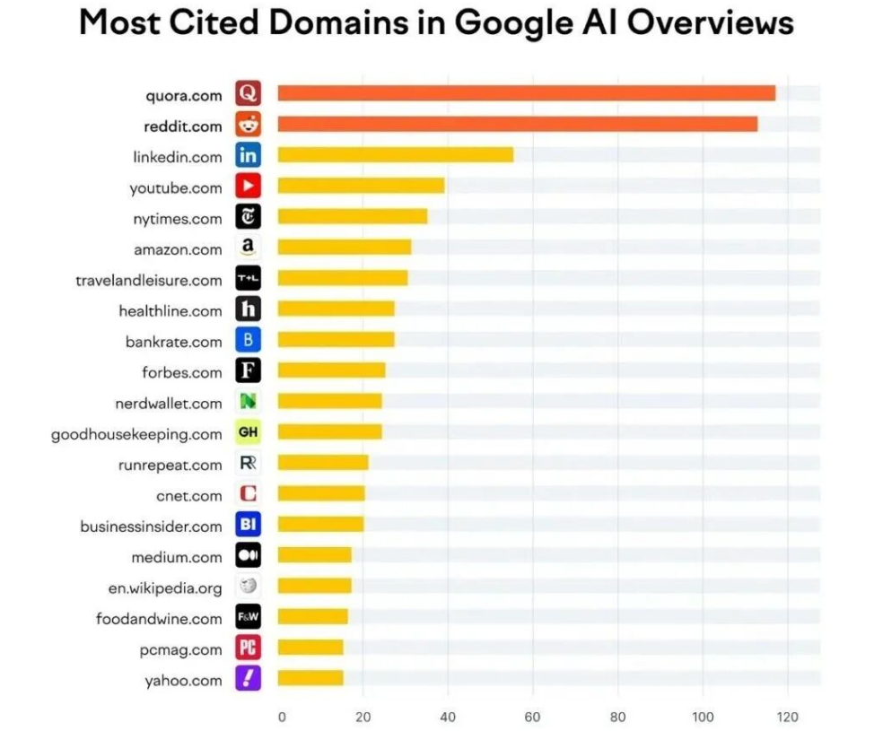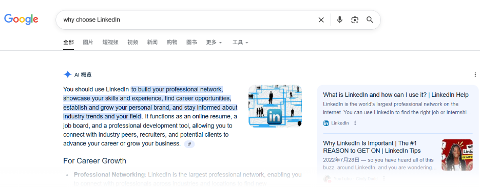 在A(yíng)I搜索生態(tài)中,LinkedIn的地位正不斷上升,它不僅是一個(gè)職場(chǎng)社交平臺,更是AI眼中的權威資料庫。在Google的AI Overview中,LinkedIn位列最常被引用的平臺之一。對于B2B企業(yè)而言,這意味著(zhù)LinkedIn不再只是一個(gè)品牌展示的窗口,而是影響AI搜索結果的重要陣地。